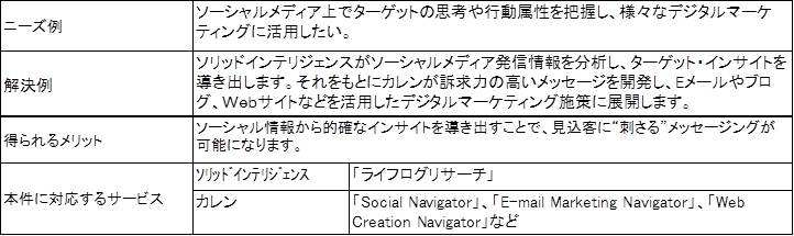 ソーシャルメディアを中心としたビッグデータの調査・分析・活用を支援するソリッドインテリジェンス株式会社(本社:東京都渋谷区、代表取締役:林健人、以下ソリッドインテリジェンス)と、デジタルマーケティング支援サービスを展開する株式会社カレン(本社:東京都新宿区、代表取締役社長:藤崎健一、以下カレン)は、ソーシャルリスニング・CRM領域における協業を開始しました。調査・分析に強みを持つソリッドインテリジェンスと、運用に強みを持つカレンの協業により、ソーシャルメディア情報を企業のマーケティング施策に取り入れ、「調査・分析-運用-効果検証」まで一貫したサービス支援を実現します。